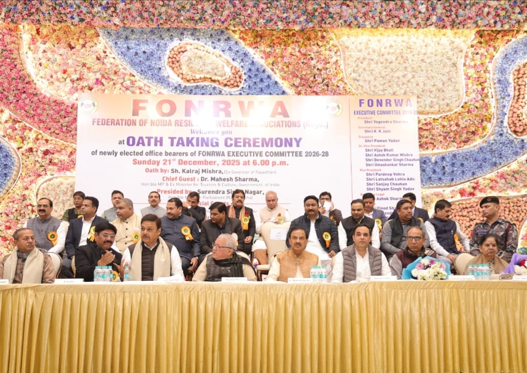 नोएडा की जनता का प्रतिनिधित्व करने वाली ‘मिनी संसद’ यानी फेडरेशन ऑफ नोएडा रेजिडेंट्स वेलफेयर एसोसिएशन (फोनरवा) की नई कार्यकारिणी का शपथग्रहण समारोह रविवार को सेक्टर 51 स्थित डायमंड बैंक्वेट में धूमधाम से आयोजित किया गया। इस भव्य कार्यक्रम में राजस्थान एवं हिमाचल प्रदेश के पूर्व राज्यपाल माननीय कलराज मिश्र ने नवनिर्वाचित 21 सदस्यीय कार्यकारिणी के पदाधिकारियों को पद एवं गोपनीयता की शपथ दिलाई। साथ ही, सभी सदस्यों को निर्वाचन प्रमाण-पत्र भी वितरित किए गए।