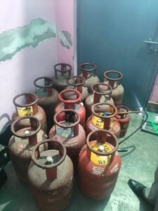 गैस रिफिलिंग के उपकरण — इलेक्ट्रॉनिक वेइंग मशीन, रिफिलिंग नोजल वाली मशीन, रबर पाइप और रेगुलेटर आदि बरामद किए गए।